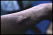 Numérisation déléments de peau, montages photographiques, inclusion de matériaux végétaux, photographies de statues blessées . La série des Cicatrices a été sélectionnée pour être exposée à la Biennale Internationale de l'Image de Nancy en Avril et Mai 2003.